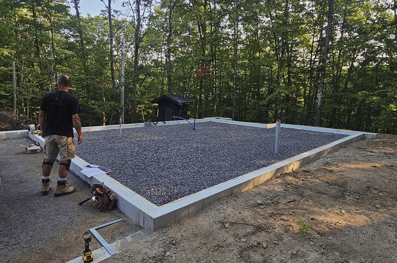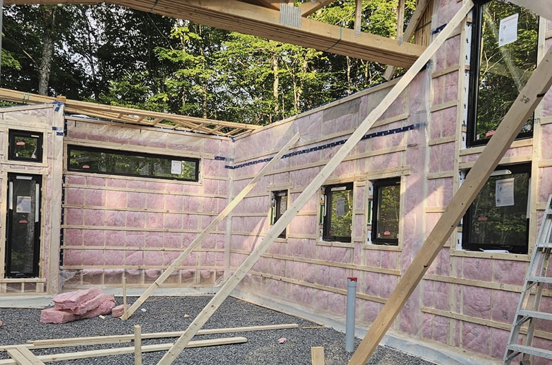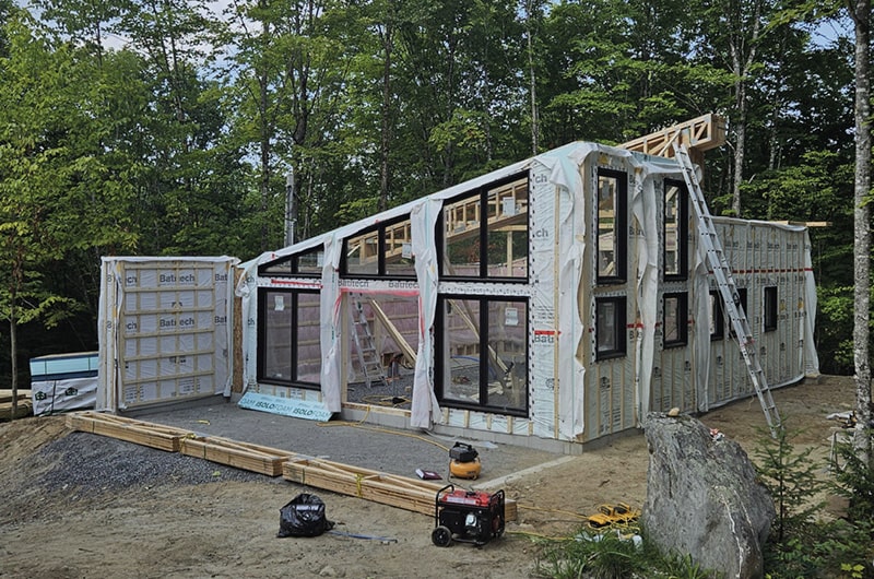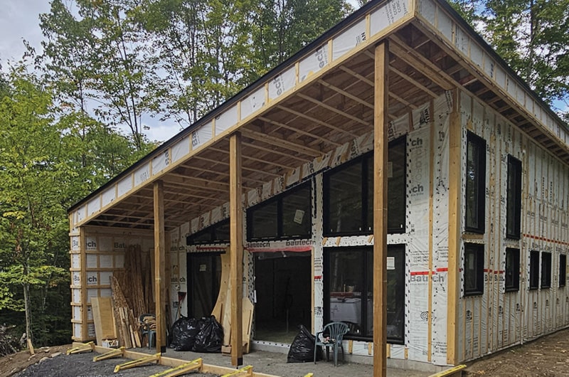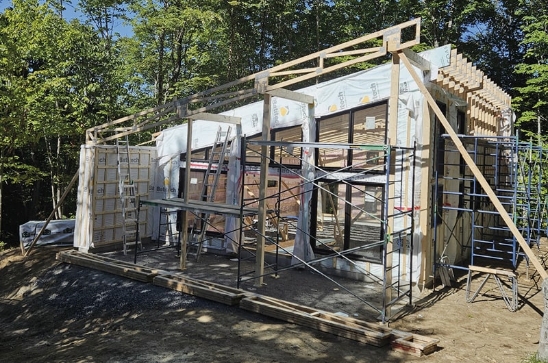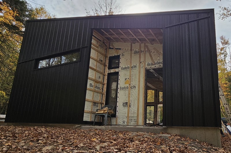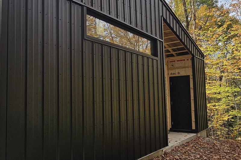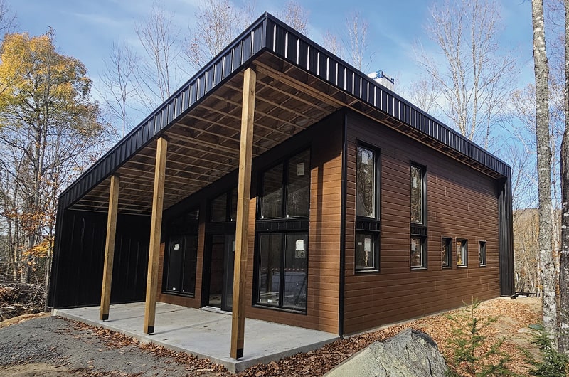 Assemblage d’une maison préfabriquée et installation des revêtements de tôle d’acier et de Canexel dans les Laurentides. Au-delà de l’enveloppe extérieure, nous avons également réalisé la conception complète des plans de services (électriques) et d’éclairage de la résidence.