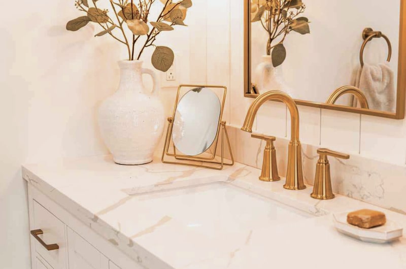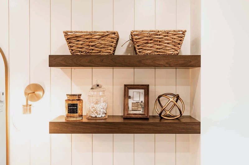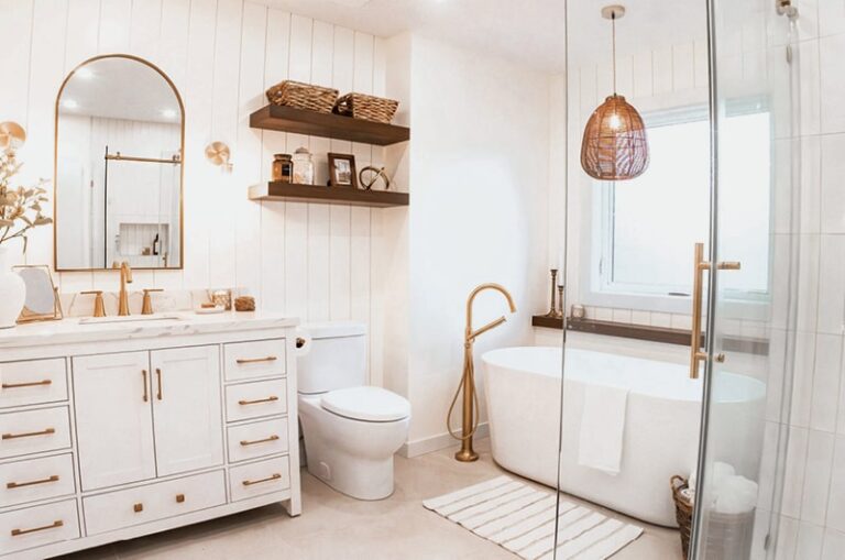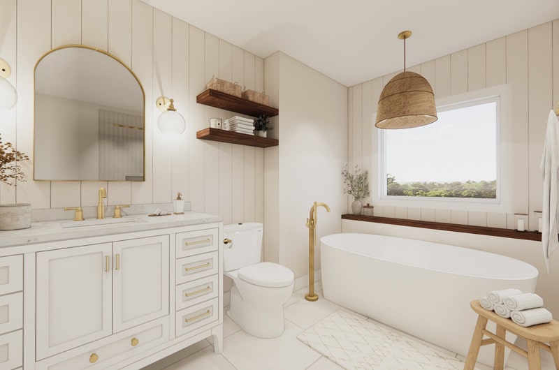 Ce projet met en lumière une transformation complète d’une salle de bain combinant chaleur, luminosité et raffinement. L’aménagement mise sur une esthétique épurée où les matériaux naturels, les lignes douces et les finis dorés créent une ambiance sereine et intemporelle. Chaque détail a été soigneusement pensé : du mobilier sur mesure à la robinetterie dorée, en passant par les étagères en bois qui ajoutent une touche organique à l’espace. La baignoire autoportante et la douche vitrée se marient harmonieusement pour offrir un espace de détente à la fois fonctionnel et élégant.