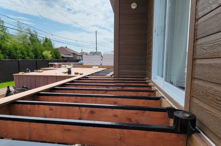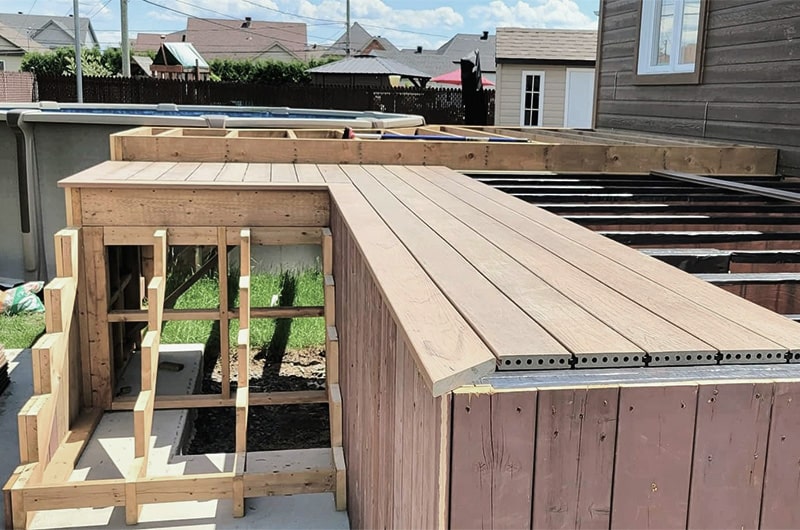 Rénovation et agrandissement d’un patio à StZotique. Solide, durable, fini d’un revêtement de composite, il perdurera dans le temps.