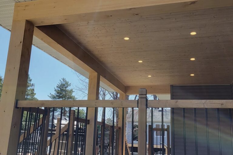 Création sur mesure d’un plafond, poutres et colonnes en planche de pin, donnant un look soigné et épuré à St-Lazare.