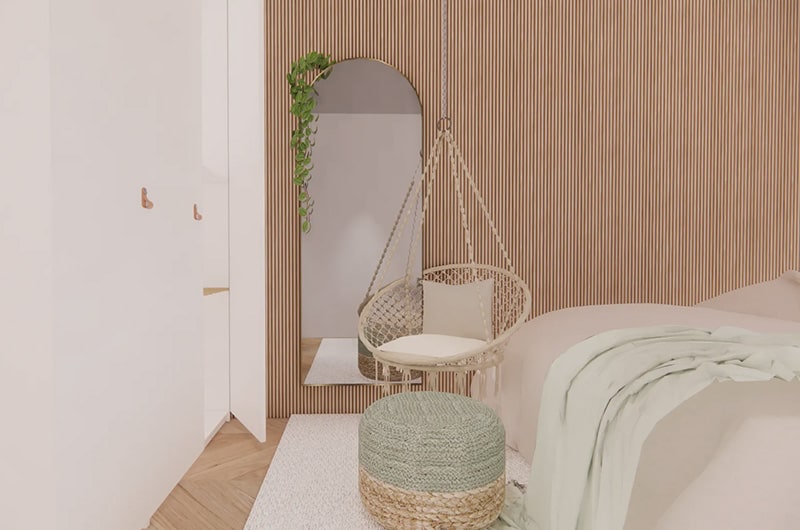 Création d’une chambre chaleureuse et mature pour une jeune adolescente souhaitant une ambiance tropicale et naturelle. Le projet consistait à transformer entièrement un ancien garage en espace de vie confortable, lumineux et fonctionnel. L’aménagement intègre des matériaux naturels, des teintes douces et une atmosphère zen inspirée du style tropical moderne. Le design mise sur un mur accent en lattes de bois, un mobilier en rotin, des textures légères et un jeu de verdure pour créer une ambiance apaisante et raffinée. En plus de la chambre, la reconfiguration de l’espace a permis d’ajouter une zone de rangement pratique pour toute la famille, optimisant ainsi chaque mètre carré.