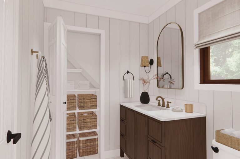 Ce concept de salle de bain de style «Modern Farmhouse» vise à créer un espace lumineux, chaleureux et fonctionnel, malgré la petite superficie de la pièce. Le design met en valeur un meuble-lavabo en bois canadien, des lambris verticaux et des accents en laiton qui apportent une touche moderne et intemporelle.